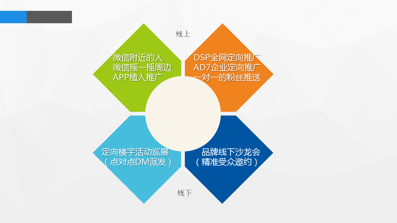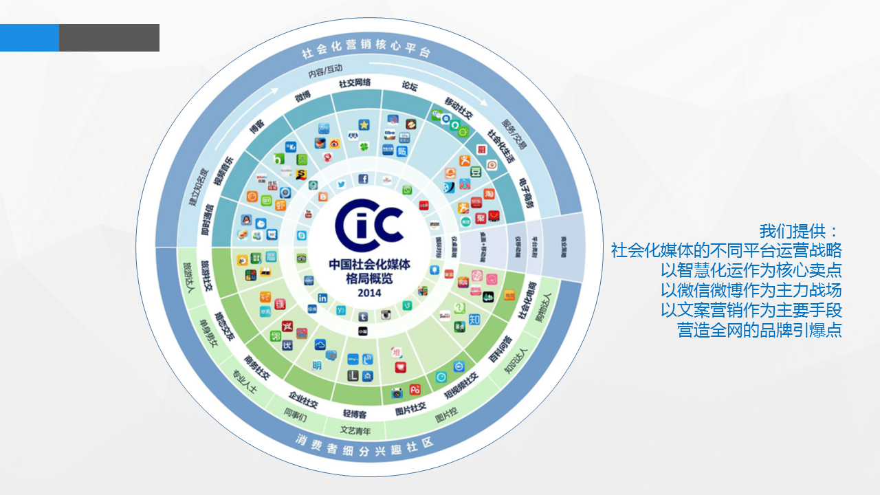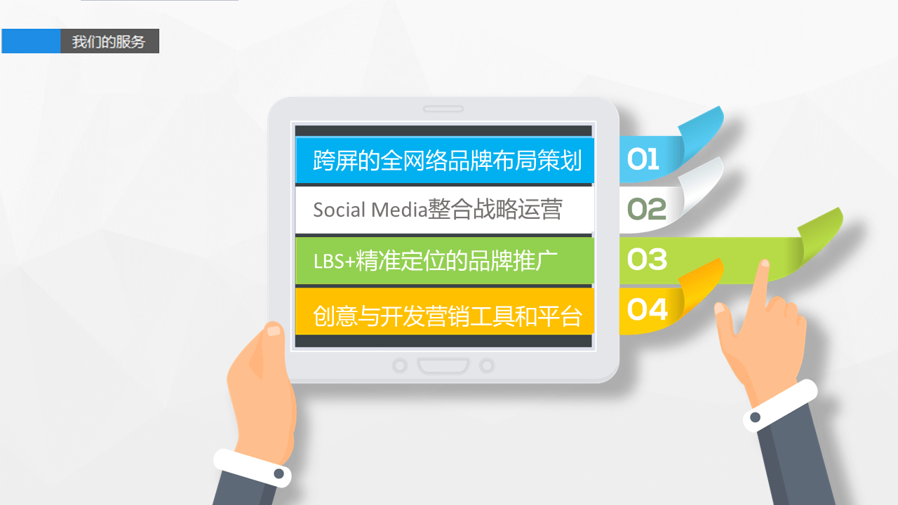 跨屏的全网络布局策划 SocialMedia整合战略运营 LBS+精准定位的传播/推广 创意开发最具互动性的营销工具和平台